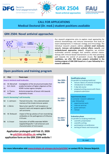 The research training group GRK 2504 – “Novel antiviral approaches: from small molecules to immune intervention” at the Friedrich-Alexander-Universität (FAU) was approved by the committees of the Deutsche Forschungsgemeinschaft (DFG) in May 2019 and prolonged into a second funding period in November 2023. Accordingly, our training and research programme began in October 2019. While two cohorts of doctoral students have finished their theses, the third cohort of doctoral researchers for a Dr. rer. nat. is in ongoing projects. In our cooperation project with the Ragon Institute of MGH, MIT and Harvard in Boston, we collaborate with associated doctoral researchers. Doctoral candidates in human medicine and clinician scientists complete our research training group with translation to the clinics.