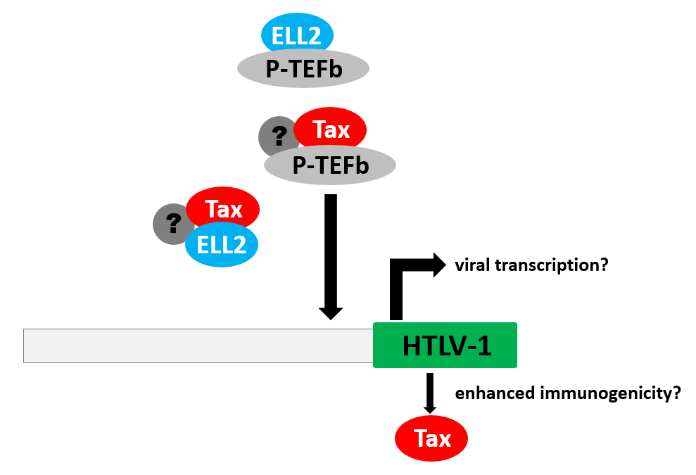The aim of my project is to elucidate the protein complex that guides HTLV-1-transcription and to interfere with this complex to enhance viral transcription. Enhanced viral gene expression should then expose the viral reservoir to immune destruction. The HTLV-1-encoded oncoprotein Tax functions as a transactivator of viral gene expression, is essential for replication of HTLV-1 by recruiting host cell factors like positive transcription elongation factor b (pTEFb) to the viral promotor and interacts with transcription elongation factor ELL2. Starting point of my project is to further characterize the Tax:ELL2 interaction, which will help to gain novel insights into the composition of the protein complex guiding HTLV-1 transcription. ELL2 enhances Tax-mediated transactivation of the viral promotor and plays a role in viral gene regulation. Even though a Tax:ELL2 complex has been described, it is still unknown which domains of Tax and ELL2 are essential for the interaction and how this interaction affects viral gene expression.