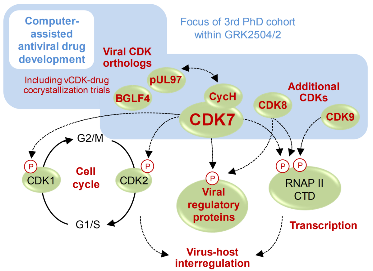 Herpesviruses have evolved effective regulatory properties to modulate the host cell cycle (Schütz et al., 2021). These include reprogramming activities on the normal function of cyclin-dependent kinases (CDKs) towards a virus-supportive role in replication efficiency (Steingruber et al., 2019). The regulatory importance of CDKs for herpesviral replication is crucial for three functional areas (see figure). It was a specific highlight of our studies to see that herpesvirus-encoded protein kinases, such as human cytomegalovirus (HCMV) pUL97 or Epstein-Barr virus (EBV) BGLF4, represent viral CDK orthologs (vCDKs) on the basis of structural and functional similarities (Schütz et al., 2022; Steingruber & Marschall, 2020). Even more striking was the identification of a number of substrate proteins being dually phosphorylated by both CDKs and vCDKs simultaneously, sometimes even at identical substrate phosphosites (Couté et al., 2020). This underlines the strategy of drug targeting towards host CDKs and vCDKs. Dual phosphosubstrates are vCDK/pUL97 itself, pUL69 and pUL50-pUL53 (the core nuclear egress complex presently studied in the 2nd PhD project). Recently, a first pUL97-specific inhibitor (maribavir) has been clinically approved for anti-HCMV therapy. Our work aims to extend the targeting options against HCMV pUL97 and EBV BGLF4 (Wild et al., 2021; Wild et al., 2022; Hutterer et al., 2016) since no anti-EBV treatment is available so far. Our approach is mainly based on computer-assisted methods of antiviral drug development focusing on CDKs/vCDKs. In parallel, crystallization approaches are optimised with recombinant vCDKs to support the structure-based in silico modelling. In essence, such CDK/vCDK-specific small molecules shall be utilised for both, virus-selective or broad-spectrum antiherpesviral drug development.
